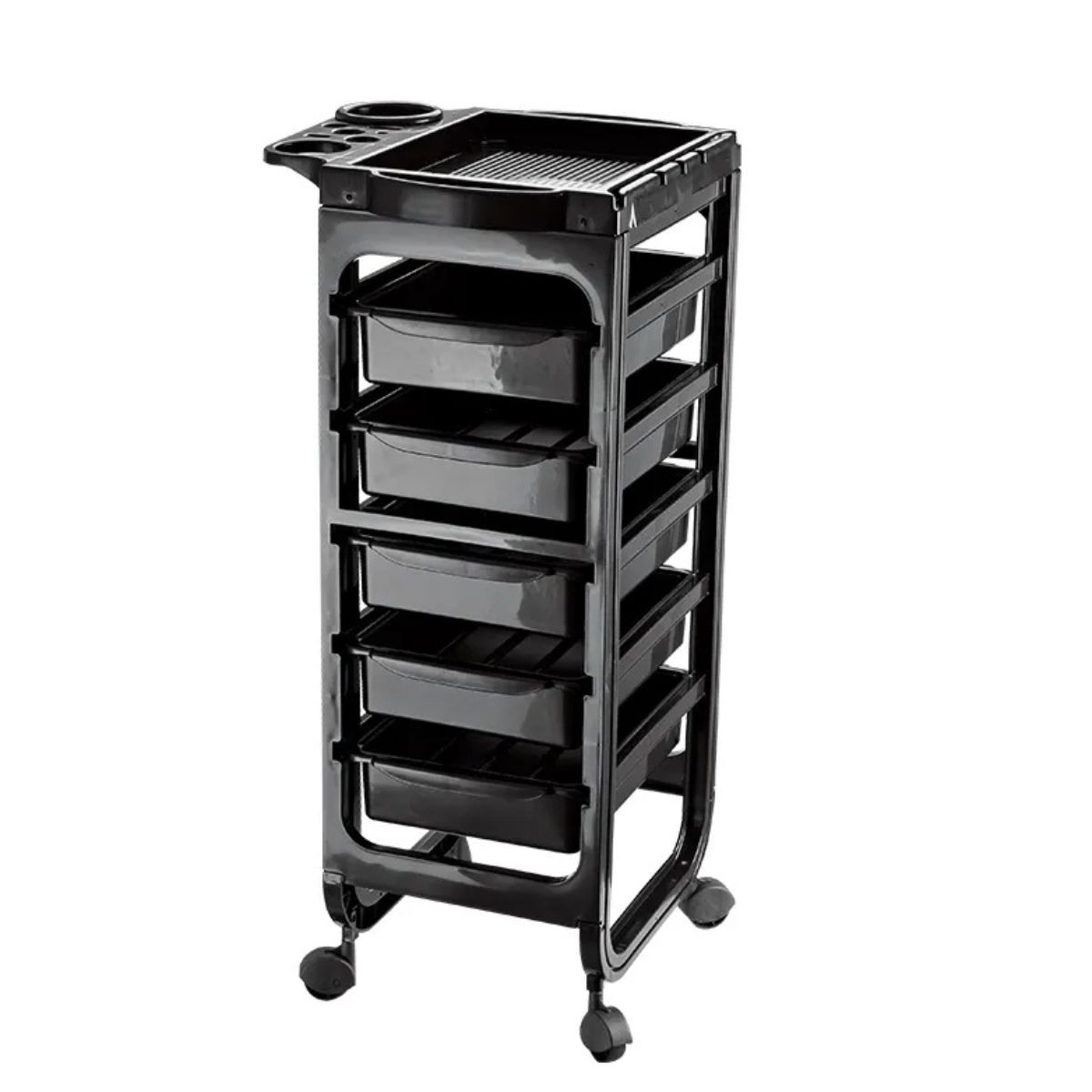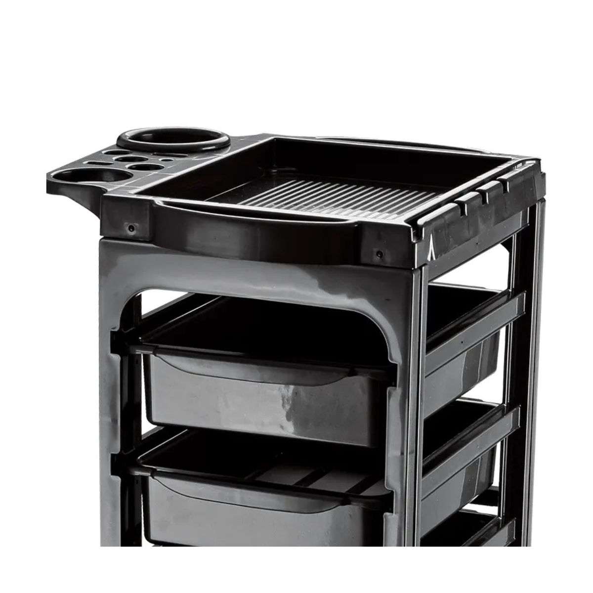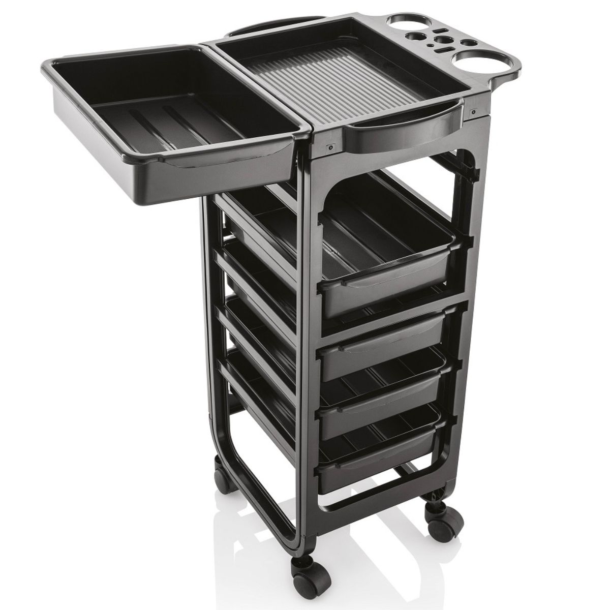 El diseño simple pero moderno del carro tiene cinco cajones mas una bandeja para herramientas y otros equipos. La parte superior tiene soportes integrados para secadores de pelo y botellas (por ejemplo, Hairspray)